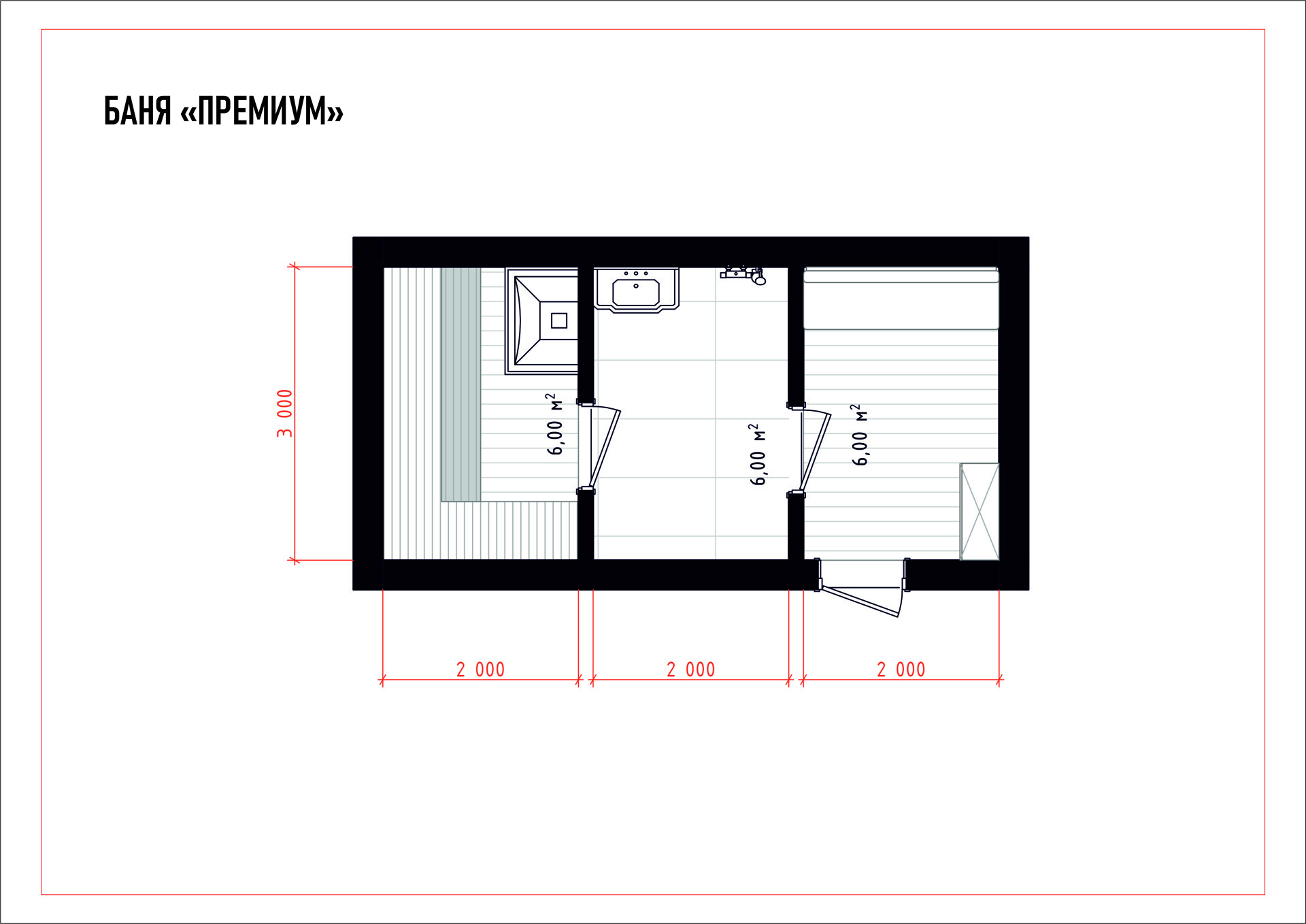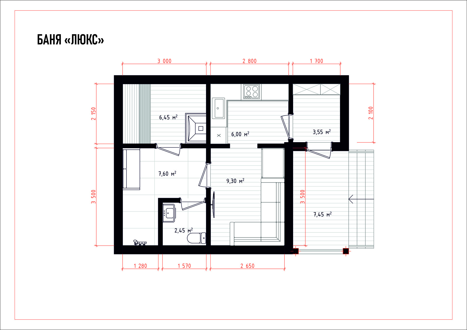 При таких размерах можно разместить зону для отдыха, в которой будет достаточно места для дивана или кресел, а также просторная комната для парения.